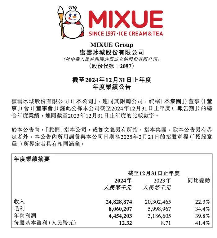 年报数据显示,蜜雪冰城2024年实现营业收入248.3亿元,同比增长22.3%;毛利从2023年的59.99亿元增长至2024年的80.60亿元,增幅达34.4%;年内利润更是从2023年的31.87亿元攀升至44.54亿元,净利润增长幅度高达39.8%。